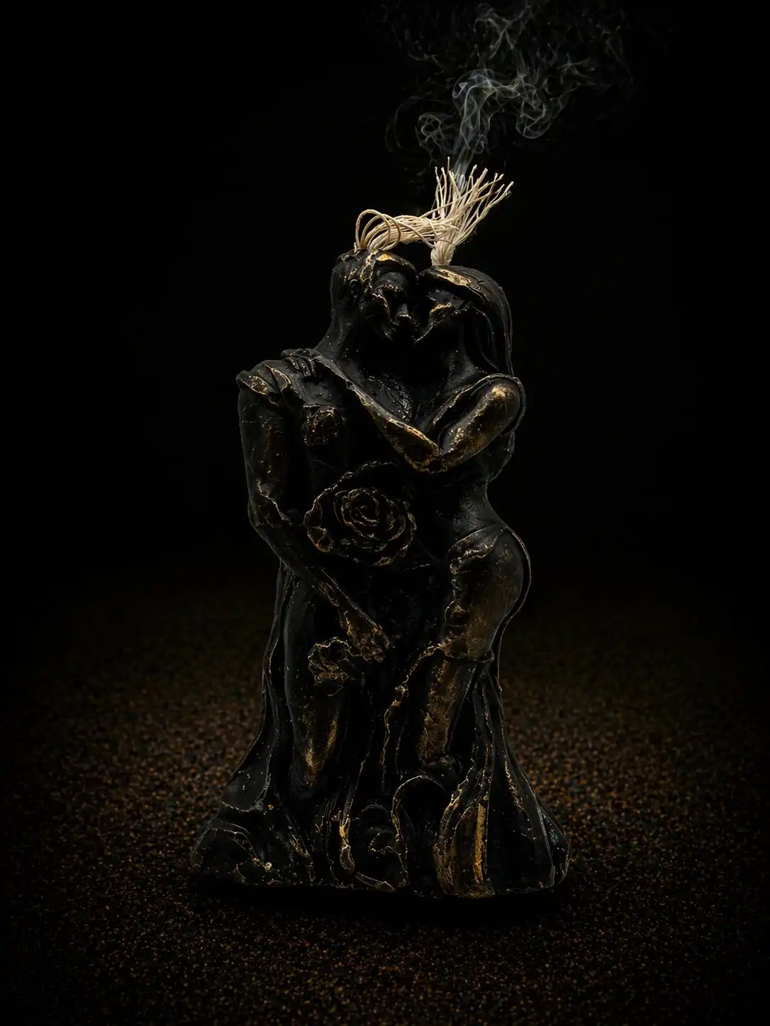 Свеча выполнена в форме страстно обнимающейся пары, символизируя глубокую любовь, притяжение и эмоциональную близость. Дизайн отражает сильную физическую и энергетическую связь между людьми. Чёрный цвет ассоциируется с защитой, скрытой притягательностью и очищением от негатива. Подходит для ритуалов на любовь и возрождение страсти в отношениях.
