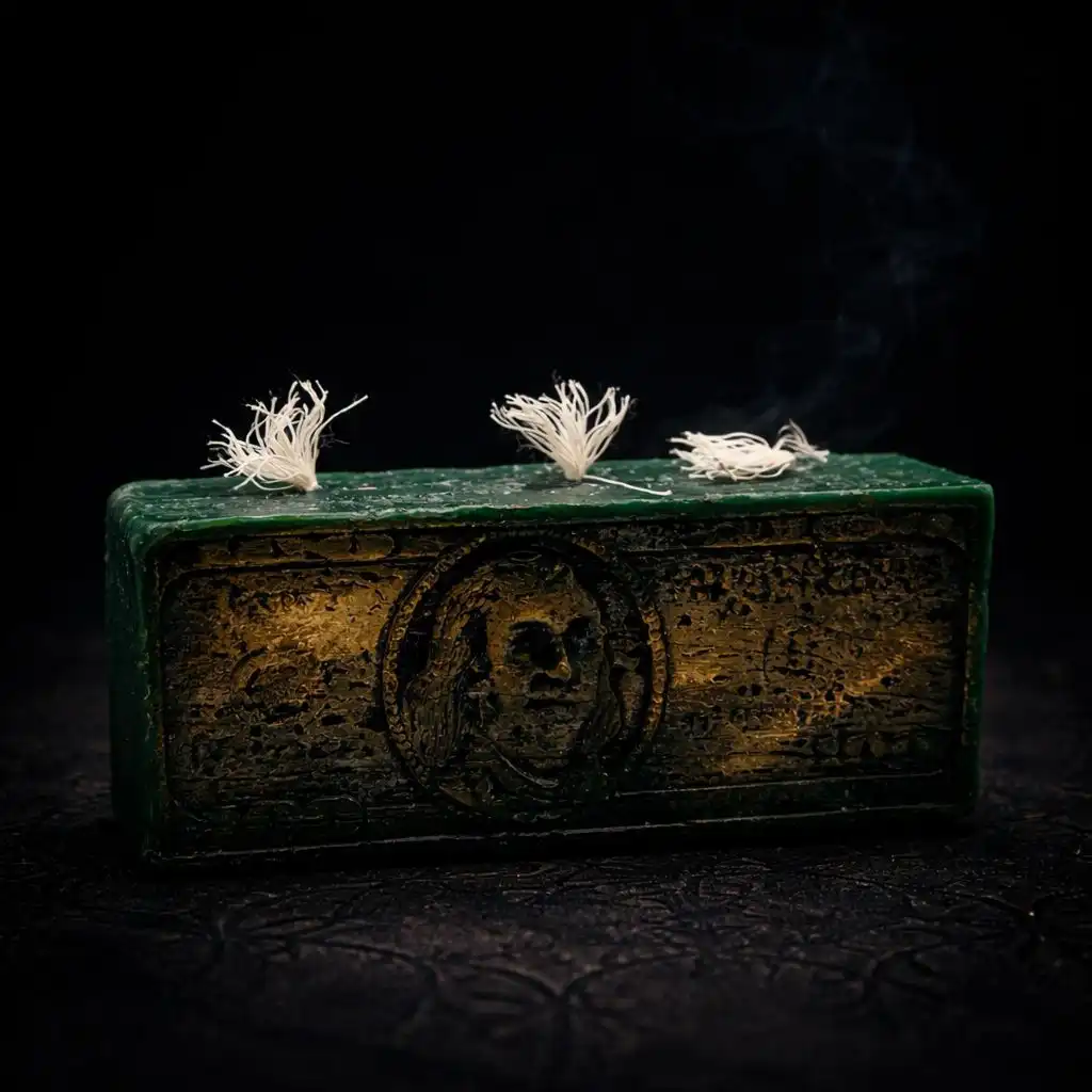 Свеча выполнена в форме денежного блока с символикой доллара. Символизирует изобилие, финансовый поток и стабильность. Используется для привлечения денег и расширения финансовых возможностей. Зелёный цвет усиливает энергию успеха и процветания.