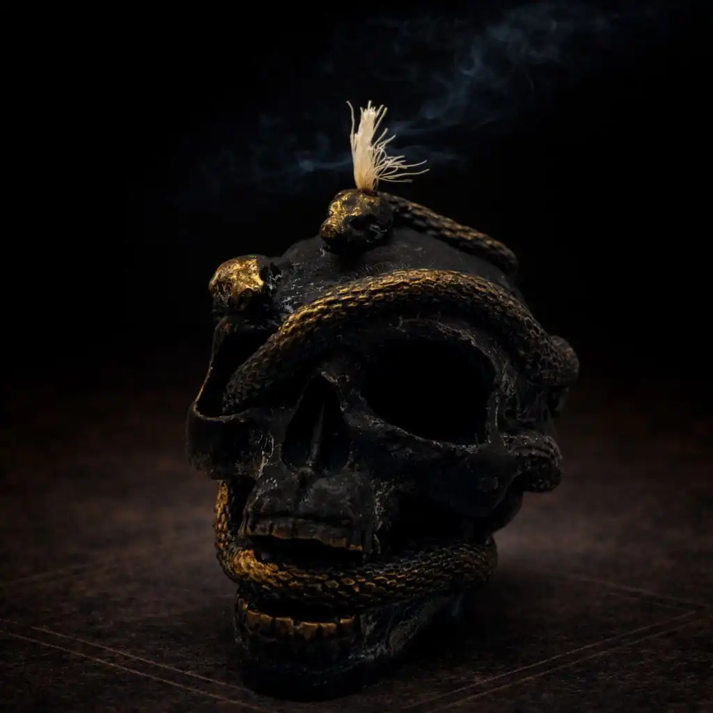 Bu qara şam kəllə və onu saran ilan motivi ilə hazırlanıb. Dizayn ölüm və yenidən doğuluş, transformasiya və gizli bilikləri simvolizə edir. İlan dəyişimi və yenilənməni, kəllə isə köhnə mərhələnin sonunu ifadə edir. Qara rəng qoruma və güclü enerjini təmsil edir. Güclü transformasiya, qoruma və dərin enerji ritualları üçün istifadə olunur.