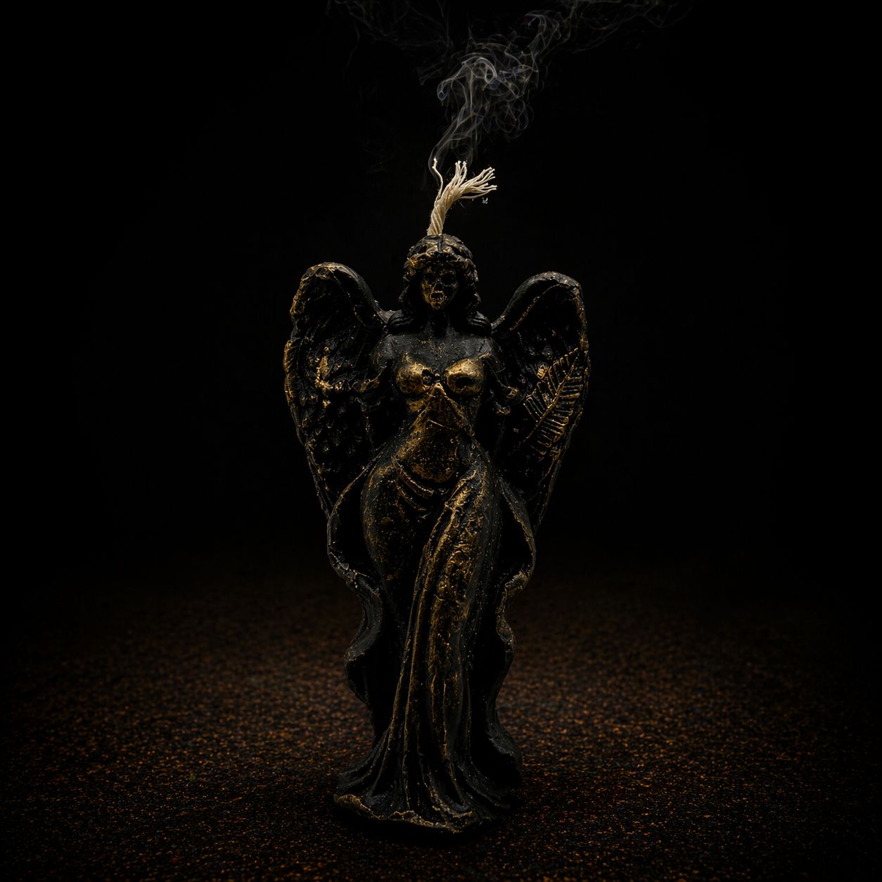 Bu şam qanadlı mələk fiquru ilə hazırlanıb və qoruyucu güc, daxili transformasiya və gizli enerjini simvolizə edir. Qaranlıq estetika ilə təqdim olunan dizayn həm işıq, həm də kölgə enerjilərinin balansını ifadə edir. Qara rəng mənfi enerjidən qorunma, ruhani güclənmə və daxili dəyişikliklə əlaqələndirilir. Meditasiya, enerji təmizləmə və şəxsi gücü artırmaq üçün istifadə olunur.