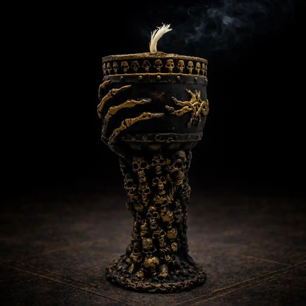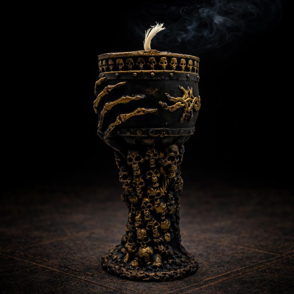 Bu şam qədim ritual qədəhini xatırladan forması və skelet motivləri ilə hazırlanıb. Dizayn güc, transformasiya və köhnənin sonlanıb yeninin başlamasını simvolizə edir. Qədəh forması enerjinin toplanması və yönləndirilməsini ifadə edir, skelet detalları isə keçmişdən azad olma və daxili dəyişimi göstərir. Qara rəng qoruma, güclü enerji və dərin fokus ilə əlaqələndirilir. Enerji toplamaq, meditasiya və daxili transformasiya məqsədləri üçün istifadə olunur.