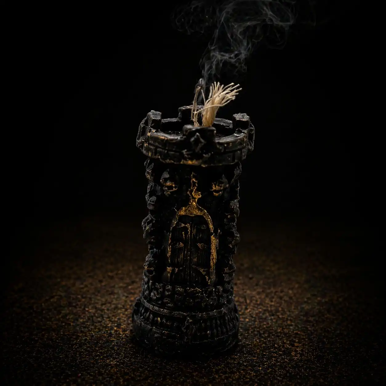 Bu şam qədim qüllə formasında hazırlanıb və güc, qorunma və sirli bilikləri simvolizə edir. Qüllə simvolu enerji mərkəzi, yüksəliş və gizli güclərin qorunmasını ifadə edir. Qara rəng mənfi təsirlərin uzaqlaşdırılması və daxili gücün aktivləşdirilməsi ilə əlaqələndirilir. Bu şam qoruyucu rituallar, enerji gücləndirmə və şəxsi inkişaf üçün istifadə olunur.